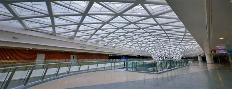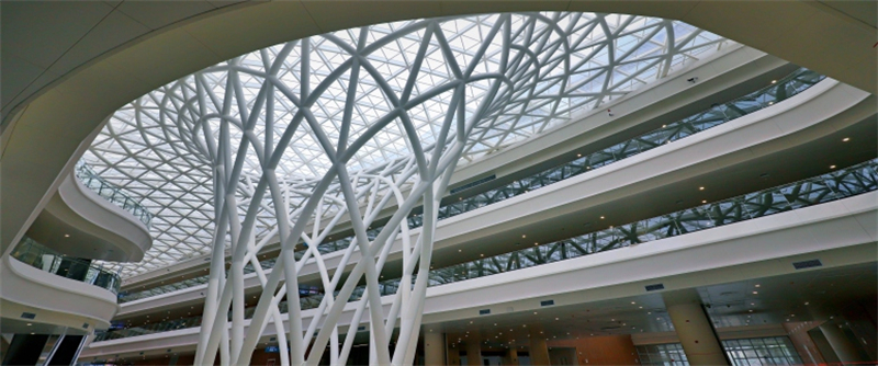 项目位于浙江省湖州市,结构形式:空间网壳结构。长轴108m,短轴20m。上层采光顶由箱形弯扭构件组成,下层生命树由空间弯曲圆管构件组成。构件深化设计、加工制作、现场安装难度大。